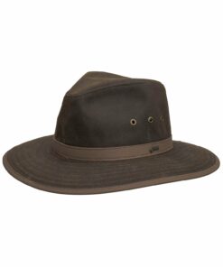 This stunning Bronze Oilskin hat is beautifully finished with leather accents on both the brim and headband.