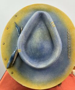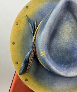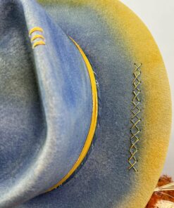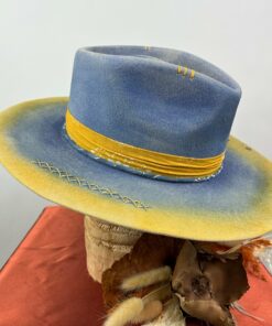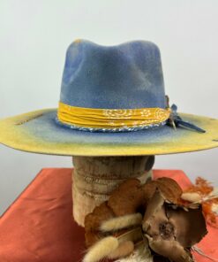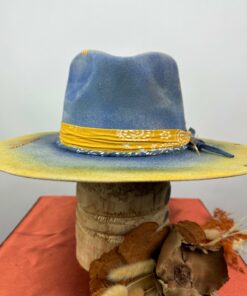 “Distressed Fedora Blue and Yellow Ombre Road Warrior” is hand-distressed, hand-dyed, and hand-torched, ensuring no two share the same color or design. Each piece is uniquely imperfect, with subtle variations from product images.