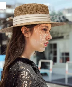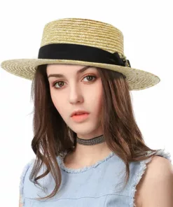 Flat Top Straw Beach Hat with Tie Top