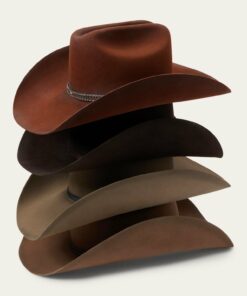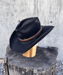 It has a low profile Gus creased crown that is 4.75″ in the back and slopes to 4.25″ in the front. The 3.75″ brim has a small pencil curl on the sides and a nice slope in the front and back. It is topped off with an antique looking leather hat band. We really like this one with its unique look and versatility.